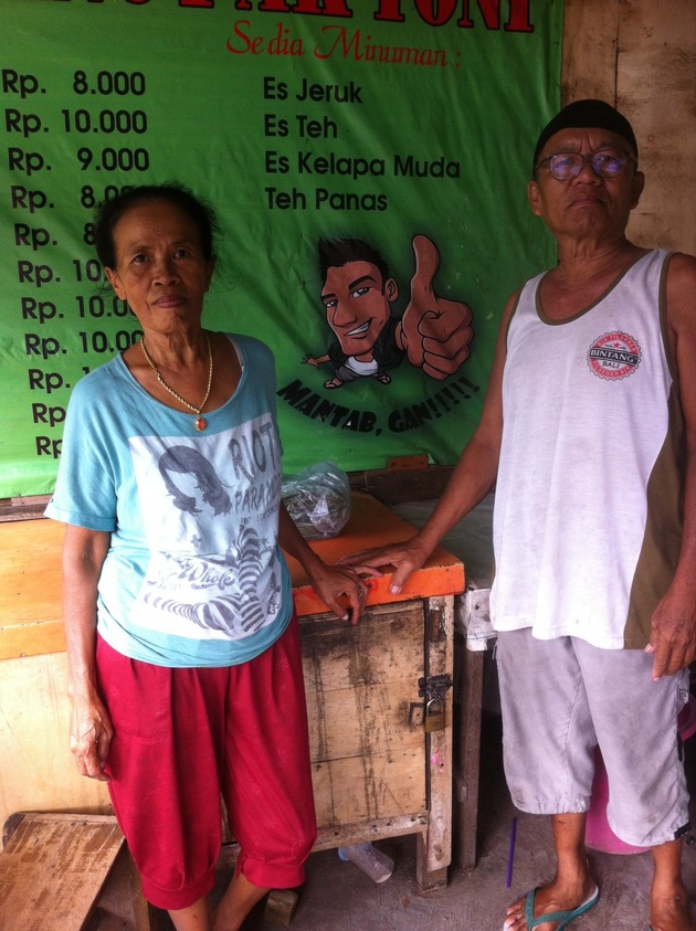 Mit Edi (60 Jahre) und dessen ein Jahr älterer Ehefrau Asmawati fördert die Hösbacher Hilfsorganisation Global Micro Initiative e.V. erstmals ein Ehepaar im Seniorenalter. Das Paar, das vor gut 30 Jahren von Ost Java nach Bali umsiedelte, betreibt einen kleinen Imbiss in der Nähe einer Bushaltestelle. Dort verkaufen sie selbst zubereitetes Nasi Goreng und Rujak Cingur. Trotz 17 Stunden täglicher Öffnungszeit bleiben den beiden pro Person nur knapp 2,50 EUR pro Tag übrig. Hiervon müssen sie die Miete für ihren Imbiss-Stand bezahlen sowie die Pacht für das kleine Grundstück, auf das sie während der vergangenen 30 Jahre Stück für Stück ein einfaches Haus gebaut haben.