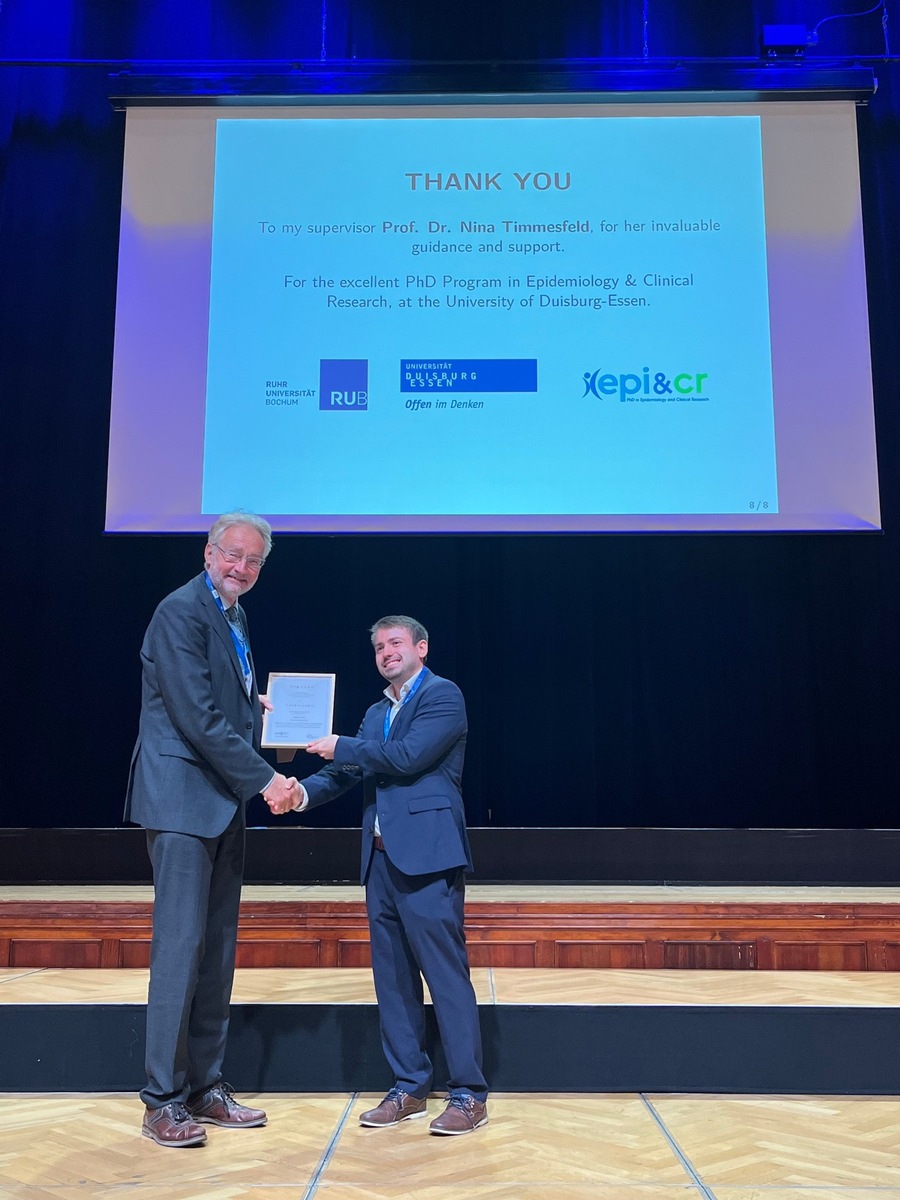 Dr. Robin Denz, Wissenschaftlicher Mitarbeiter in der Abteilung für Medizinische Informatik, Biometrie und Epidemiologie an der RUHR-Universität Bochum und erfolgreicher Absolvent des PhD-Programms „Epidemioloy and Clinical Research“ der Medizinischen Fakultät der Universität Duisburg-Essen, erhielt auf der Jahrestagung der Deutschen Gesellschaft für Medizinische Informatik, Biometrie und Epidemiologie (GMDS) e.V. den Förderpreis für die beste Dissertation im Fachbereich Epidemiologie.