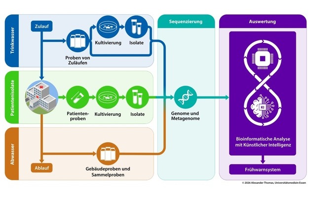 Um Infektionsgeschehen frühzeitig zu erkennen und besser zu verstehen, entwickelt das interdisziplinäre Forschungsteam im Projekt VaSequIs ein System für vergleichende Untersuchungen von Proben aus der Patientenversorgung sowie solchen, die sie an den kritischen Stellen zwischen öffentlicher Wasserversorgung, Universitätsklinikum Essen (UK Essen) und dem Abwassernetz gewinnen. So wollen sie nachvollziehen, welche und wie viele Krankheitserreger vorherrschen, um mögliche Infektionsausbrüche zu erkennen und zu verhindern. Prof. Dr. Jan Buer, Dekan der Medizinischen Fakultät der Universität Duisburg-Essen (UDE) und Direktor des Instituts für Medizinische Mikrobiologie, und Prof. Dr. Martin Exner, Präsident der Deutschen Gesellschaft für Krankenhaushygiene, leiten das Projekt. Beteiligte Wissenschaftler der UDE sind zudem aus dem Institut für Künstliche Intelligenz in der Medizin (Prof. Dr. Folker Meyer), aus der Krankenhaushygiene (Dr. Robin Otchwemah) sowie dem Institut für Medizinische Mikrobiologie (PD Dr. Jan Kehrmann).