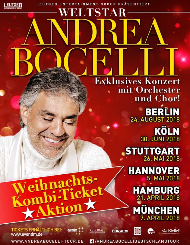 Weitere Infos finden Sie auf: [www.andreabocelli-tour.de] (http://www.andreabocelli-tour.de/) und [www.facebook.com/andreabocellideutschlandtour] (http://www.facebook.com/andreabocellideutschlandtour)