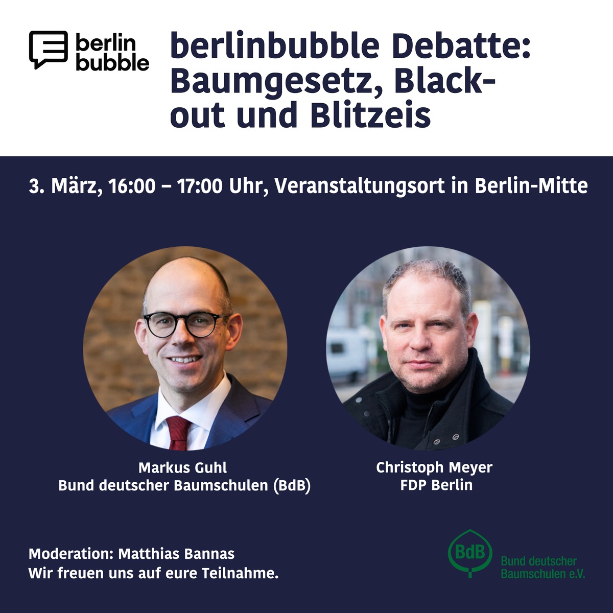 Am 3. März von 16:00 bis 17:00 Uhr, diskutieren Markus Guhl, Hauptgeschäftsführer vom Bund deutscher Baumschulen (BdB) e.V. und Christoph Meyer, Landesvorsitzender der FDP Berlin, zum Berliner Baumgesetz, zur Verwendung des Berliner Anteils am Infrastruktur-Sondervermögen des Bundes und zum Umgang Berlins mit dem wochenlangen Glatteis und das vielleicht auch mit Ihnen? Jede:r ist zur Teilnahme eingeladen.