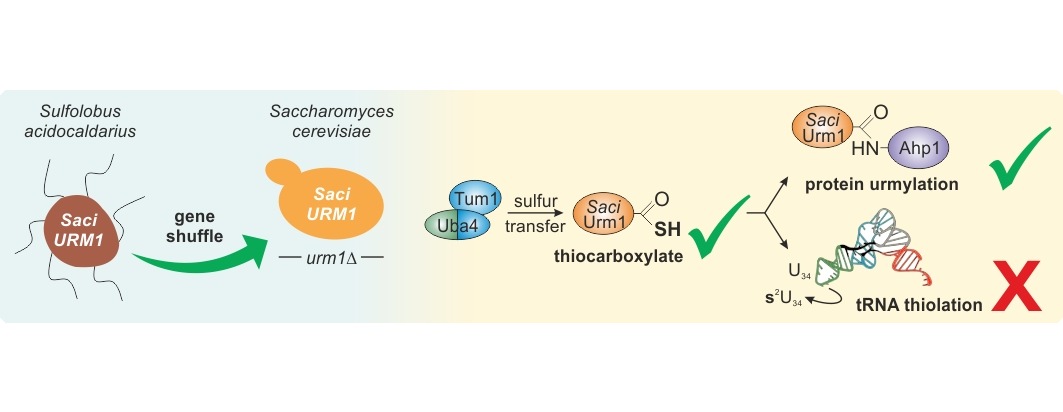 Die Kasseler Doktoranden Katharina Zupfer und Lars Kaduhr untersuchten eine Variante von Urm1 aus Archaeen experimentell in Hefezellen. Archaeen sind Mikroorganismen, die in extremen Lebensräumen existieren und evolutionär sehr früh entstanden sind. Dabei zeigte sich, dass das Archaeen-Urm1 Protein an ein hefeeigenes Protein gebunden werden kann. Es unterstützt damit also den grundlegenden Mechanismus der Urmylierung auch im fremden Umfeld einer Hefezelle. Dies ist bemerkenswert, da die Organismen Milliarden Jahre evolutionär voneinander getrennt sind. Die RNA-Modifikation mit dieser Urm1 Variante bleibt dagegen aus. „Unsere Ergebnisse legen nahe, dass sich die beiden Funktionen dieses Proteins im Laufe der Evolution vermutlich getrennt weiterentwickelt haben. Dabei verläuft die Modifikation von RNA durch Urm1 wahrscheinlich komplexer ab, als die Modifikation von Proteinen“, erklärt Kaduhr. „Andere Systeme für die Proteinmodifikation sind dagegen hochkomplex und stehen in Verbindung mit vielen Krankheiten im Menschen. Diese könnten sich aus dem ursprünglichen Urm1-System entwickelt haben, das also eine Art Zwischenstufe in der Evolution dieser Proteinfamilie sein könnte“, ergänzt Zupfer. „Für uns war es zu Beginn erstaunlich, dass das Archaeen-Urm1 Protein überhaupt in der Hefezelle gebildet wird und wir es so detailliert untersuchen konnten.“