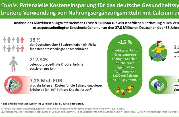 18 Prozent der Deutschen über 55 Jahre haben ein erhöhtes Risiko für osteoporosebedingte Knochenbrüche. Insgesamt gibt es in Deutschland pro Jahr 212.845 Frakturen, die auf Osteoporose zurückzuführen sind. Ein verringertes Risiko um 15 Prozent entspricht 31.927 weniger Knochenbrüche, die laut Frost & Sullivan in Deutschland durch eine regelmäßige Supplementierung mit Calcium und Vitamin D vermieden werden könnten. Die Analysten von Frost & Sullivan haben errechnet, dass jeder Euro, der für die entsprechende Versorgung mit Nahrungsergänzungsmitteln ausgegeben werden würde, das Gesundheitssystem im Gegenzug um 5,09 Euro entlasten würde.