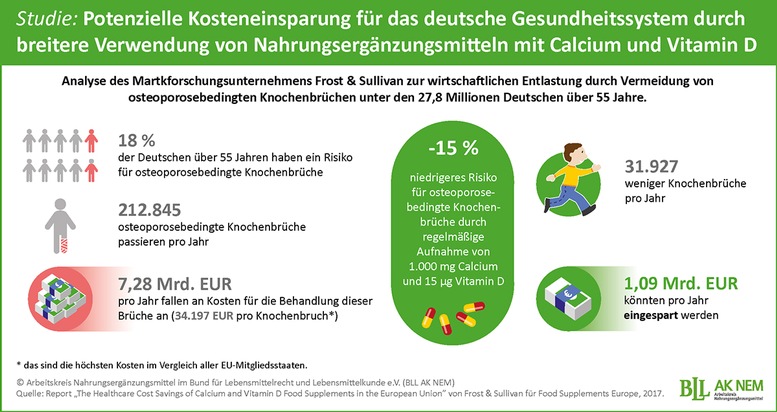 18 Prozent der Deutschen über 55 Jahre haben ein erhöhtes Risiko für osteoporosebedingte Knochenbrüche. Insgesamt gibt es in Deutschland pro Jahr 212.845 Frakturen, die auf Osteoporose zurückzuführen sind. Ein verringertes Risiko um 15 Prozent entspricht 31.927 weniger Knochenbrüche, die laut Frost & Sullivan in Deutschland durch eine regelmäßige Supplementierung mit Calcium und Vitamin D vermieden werden könnten. Die Analysten von Frost & Sullivan haben errechnet, dass jeder Euro, der für die entsprechende Versorgung mit Nahrungsergänzungsmitteln ausgegeben werden würde, das Gesundheitssystem im Gegenzug um 5,09 Euro entlasten würde.