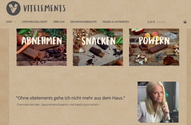 - Neuer Online-Shop unter vitelements.com - Bewährte Riegel und Drinks zum Abnehmen - Vollwertige Ernährung auf Basis natürlicher Zutaten - Ausführliche Erfahrungsberichte von Kunden