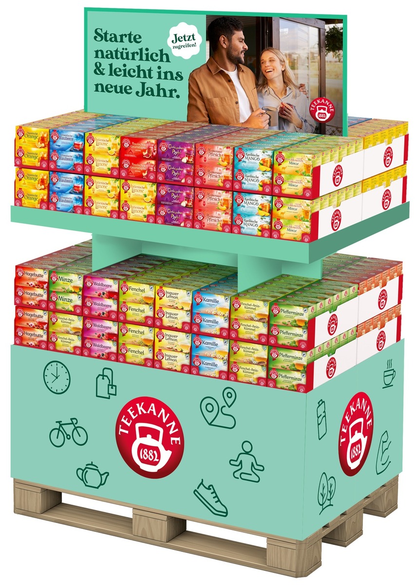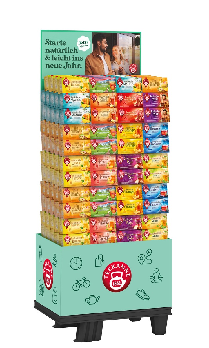 Im Zentrum der Promotion steht das beliebte Schnelldreher-Display im aufmerksamkeitsstarken Aktionslook: Die vorkonfektionierte Großplatzierung auf Europalette kombiniert frische Minttöne mit kleinen Icons, die den aktiven und leichten Lebensstil als Ziel für das neue Jahr symbolisieren und das Motto visuell unterstreichen. Bestückt mit den absatzstarken TEEKANNE Ländertees sowie den Natur-Kräuter- und Früchtetees, bietet das Display nicht nur eine große Auswahl, sondern sorgt durch seine offene Gestaltung für eine starke Sichtbarkeit und spricht Käuferinnen und Käufer an. Für kleinere Märkte oder zusätzliche Platzierungen stehen kompakte ¼-Paletten-Displays zur Verfügung, die ebenfalls mit Aktionssockeln und Topschildern das Kampagnenmotto transportieren und eine flexible Integration in verschiedenste Handelsumfelder ermöglichen. Flankiert wird die Aktion durch eine reichweitenstarke Markenkampagne in TV, Digital TV, Print, Online und Social Media, die bis Februar 2026 ausgespielt wird.