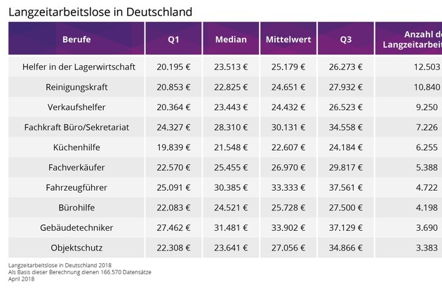 Zur Methodik: Das Vergleichsportal Gehalt.de hat in Kooperation mit der Bundesagentur für Arbeit 166.570 Datensätze von Arbeitslosen analysiert, die mindestens ein Jahr lang ohne Beschäftigung waren und das 18. Lebensjahr vollendet haben. Untersucht wurden Berufe, in die Langzeitarbeitslose am häufigsten einsteigen, sowie die dort aktuell ausgezahlten Jahresbruttogehälter. Bei allen Berufen handelt es sich um Stellen ohne Personalverantwortung.