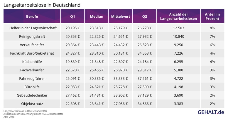 Zur Methodik: Das Vergleichsportal Gehalt.de hat in Kooperation mit der Bundesagentur für Arbeit 166.570 Datensätze von Arbeitslosen analysiert, die mindestens ein Jahr lang ohne Beschäftigung waren und das 18. Lebensjahr vollendet haben. Untersucht wurden Berufe, in die Langzeitarbeitslose am häufigsten einsteigen, sowie die dort aktuell ausgezahlten Jahresbruttogehälter. Bei allen Berufen handelt es sich um Stellen ohne Personalverantwortung.