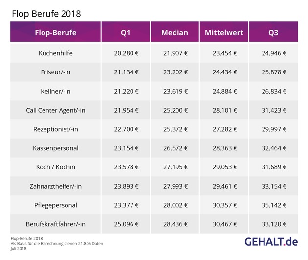 Das Vergleichsportal Gehalt.de ermittelte die jeweils zehn am besten und am schlechtesten bezahlten Berufe in Deutschland. Darüber hinaus wurden zum Vergleich fünf Berufe aus dem mittleren Gehaltssegment hinzugenommen. Die Gehaltsangaben für die Berufe basieren auf insgesamt 21.846 Datensätzen. Alle Angaben stammen von Beschäftigten ohne Personalverantwortung aus den letzten 12 Monaten. Bei den Lohnangaben handelt es sich um Bruttojahresgehälter. Sortiert wurde nach dem Median, absteigend bei den Top-Berufen sowie den Gehälter im Mittelfeld und aufsteigend bei den Flop-Berufen.