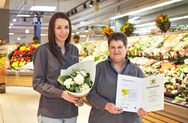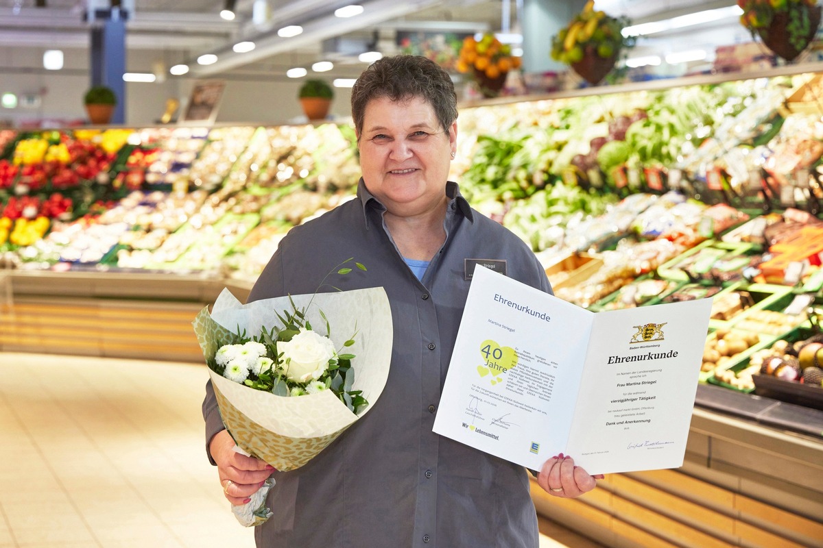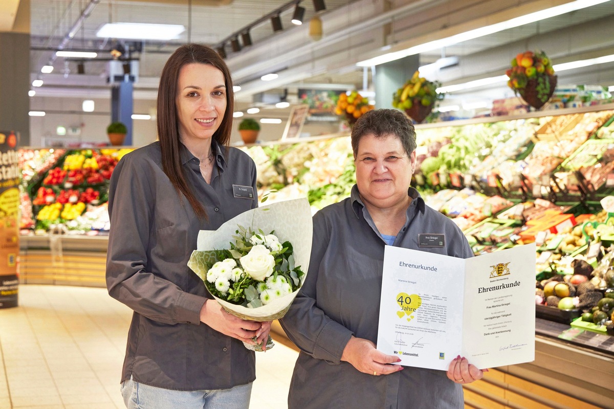 Mannheim-Neuostheim/10.04.2026 - Für ihre 40-jährige Betriebszugehörigkeit bei Edeka Südwest wurde kürzlich Martina Striegel aus Ludwigshafen geehrt. Marktleiterin Tiziana Trapani gratulierte der Jubilarin und überreichte ihr eine Urkunde sowie ein Präsent als Dankeschön.