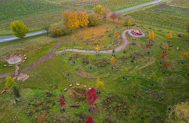 Der Platz der Begegnung, der Ökologie und der Zukunft ist offiziell Picknick-Platz und lädt ein zum Verweilen – zwischen den 52 gepflanzten Großbäumen oder auf der Anhöhe am Tisch mit herrlichem Ausblick auf die VG Edenkoben und die Haardt.