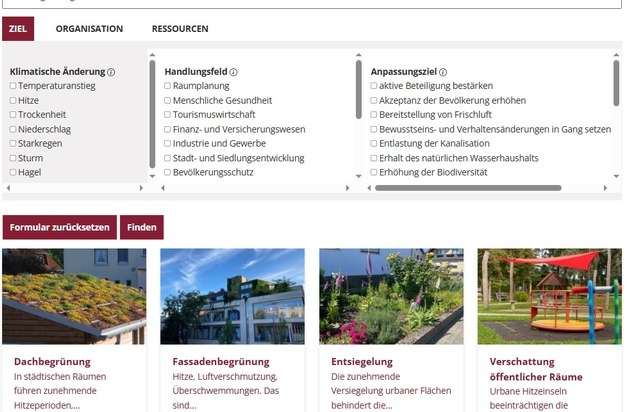 Eine neue Online-Anwendung hilft Kommunen und anderen Aktueren, geeignete Maßnahmen für Gebäude und Flächen zu finden, um diese an die Folgen des Klimawandels anzupassen.