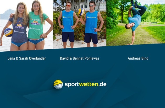 Die sportwetten.de GmbH hat nach dem Zusammenschluss mit dem DVV und der Techniker Beach Tour zwei Beachvolleyballteams unter Vertrag genommen. Die Paarungen sind David & Bennet Poniewaz, als auch die gebürtigen Berlinerinnen Lena und Sarah Overländer. Zusätzlich kam eine Kooperation mit dem amtierenden Handstand-Rekordhalter Andreas Bind zustande, der bei einigen Events für Unterhaltung sorgen wird.