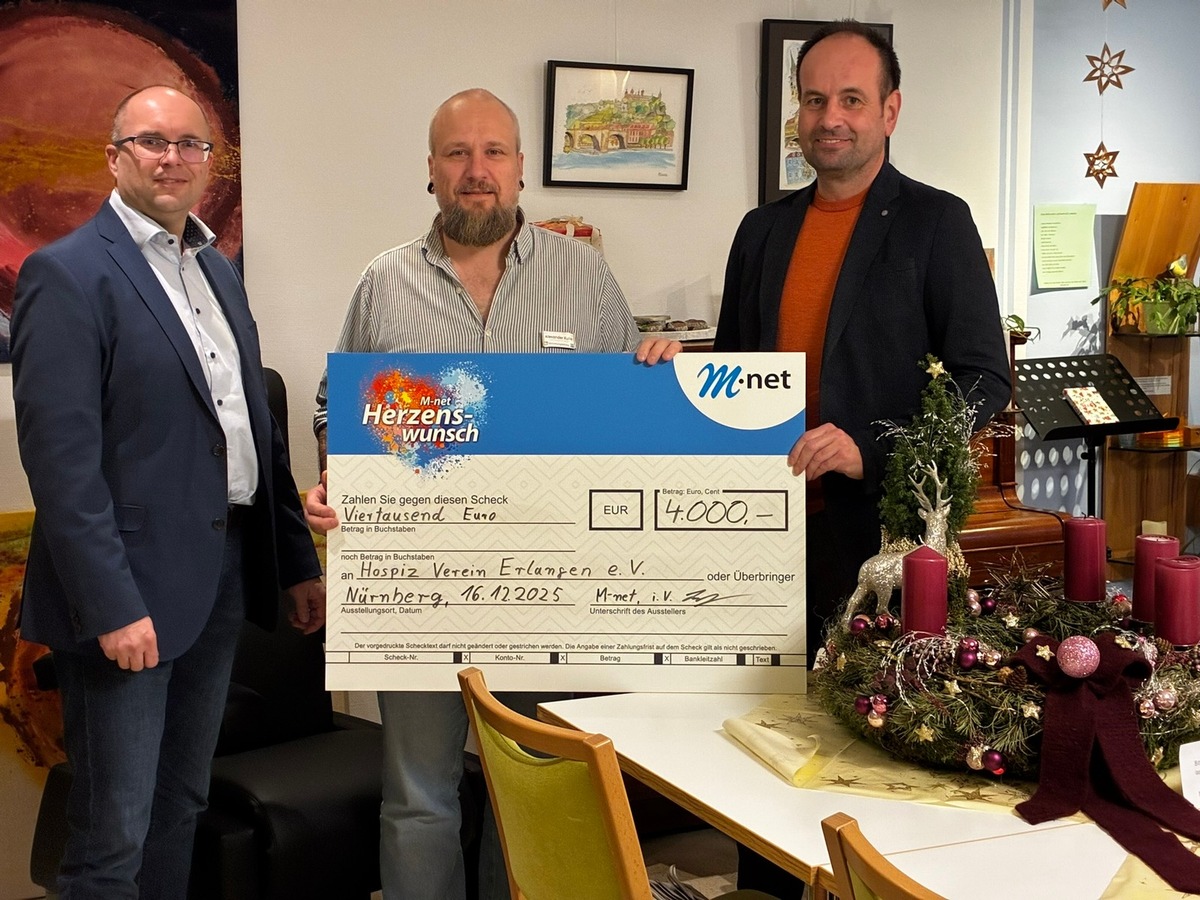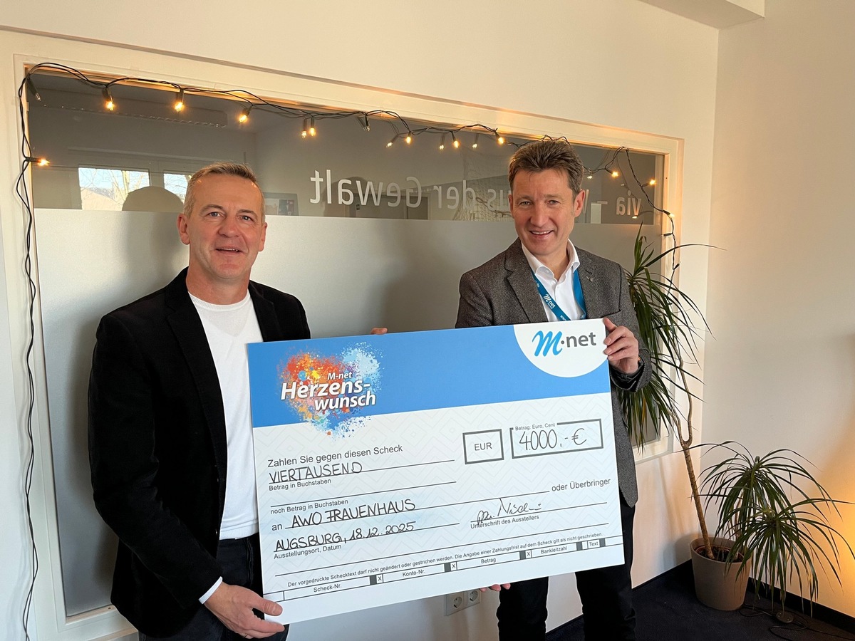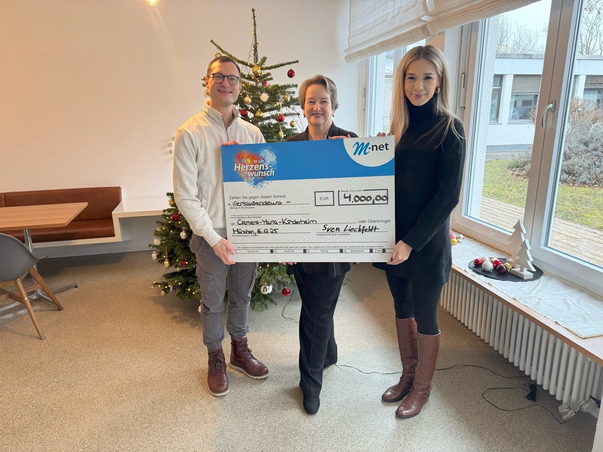 22.12.2025 – Im Rahmen der vorweihnachtlichen Benefiz-Aktion „M-net Herzenswunsch“ unterstützt Bayerns führender Glasfaseranbieter M-net bereits zum fünften Mal Hilfsorganisationen, Stiftungen und ehrenamtliche Initiativen in seinem Versorgungsgebiet. Insgesamt spendet M-net 16.000 Euro. Davon gehen jeweils 4.000 Euro an soziale Einrichtungen in München, Augsburg, Erlangen sowie Kempten, die von Mitarbeiterinnen und Mitarbeitern des Unternehmens vorgeschlagen wurden.