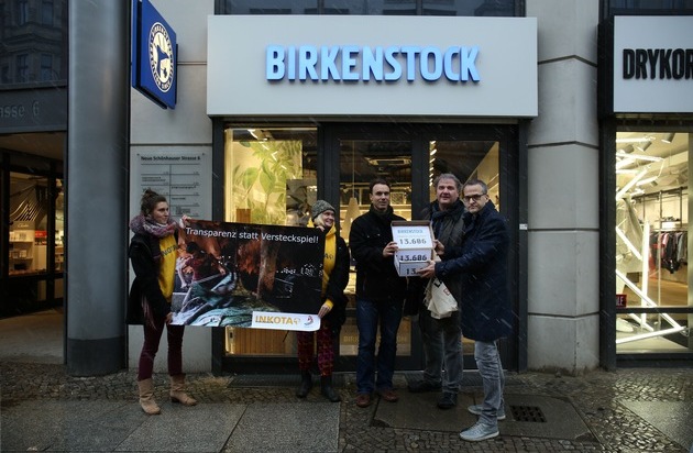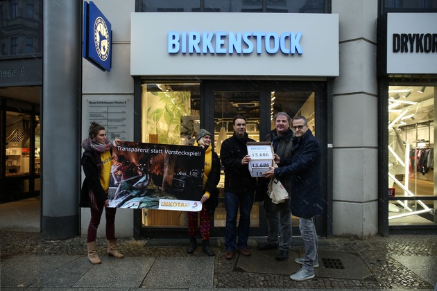 [Berlin/Bonn, 17.01.2018] - AktivistInnen der Kampagne Change Your Shoes haben heute in Berlin 13.606 Unterschriften an Birkenstock übergeben. Mit der Petition "Transparenz statt Versteckspiel" fordern sie europäische Schuhmarken und -händler auf, transparent über die Einhaltung der Men-schenrechte sowie über Gesundheit und Sicherheit am Arbeitsplatz zu berichten. Auch an den größ-ten deutschen Schuhfachhändler Deichmann und an den Verband der Schuh- und Lederwarenin-dustrie HDSL wurden die Forderungen bereits überreicht. Schuhfirmen in Deutschland versprechen nun mit der Erweiterung der CADS-Initiative Verbesserungen in Sachen Arbeits- und Sozialstandards in den Produktionsländern. Dafür müssen aber Gewerkschaften und zivilgesellschaftliche Organisa-tionen bei den Überprüfungen einbezogen werden.