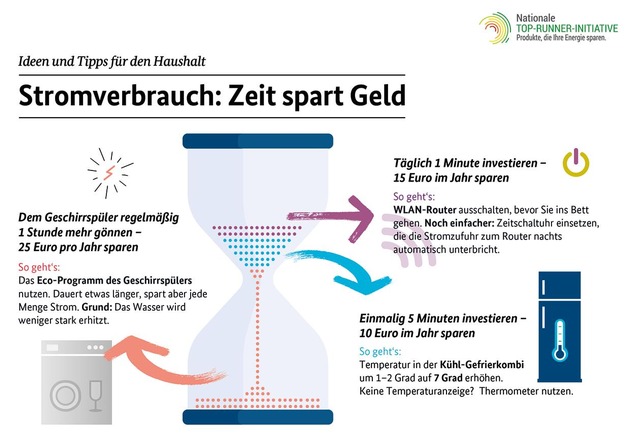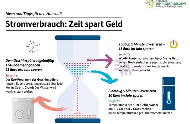 Stunde länger, man spart am Ende des Jahres aber 25 Euro.Die Nationale Top-Runner-Initiative informiert unter www.machts-effizient.de/ntri zu weiteren Tipps zum Stromsparen und zum Kauf energieeffizienter Geräte.