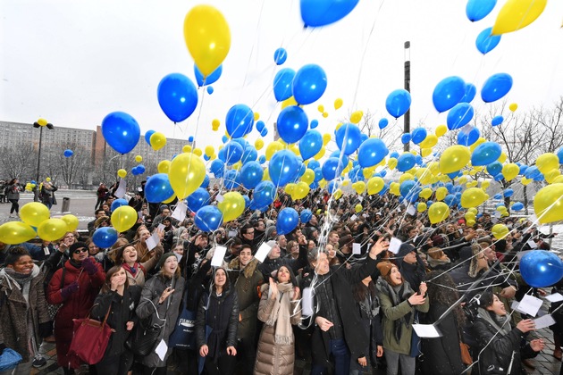 Ballon-Aktion mit Sawsan Chebli vor dem Roten Rathaus - 550 StudentInnen und WissenschaftlerInnen aus Deutschland und den USA setzen Zeichen für Völkerverständigung