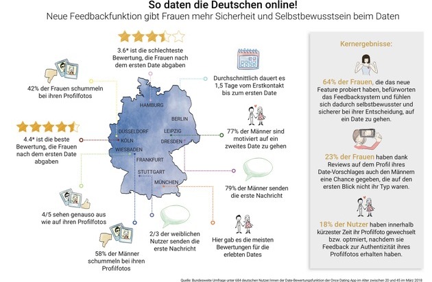 Once revolutioniert mit "Rate Your Date" das Online-Dating: Nach wenigen Wochen schon 10.000 Bewertungen allein in Deutschland. 64% der weiblichen Once-User fühlen sich durch die Bewertungsfunktion wohler. Katalysator für das Berliner Liebesleben: Nur 1,5 Tage bis zum ersten Date. In Köln bewerten Frauen ihr erstes Date mit 4,4 von 5 Sternen besonders positiv. Frankfurter und Düsseldorferinnen tricksen überdurchschnittlich bei ihrem Profilfoto.