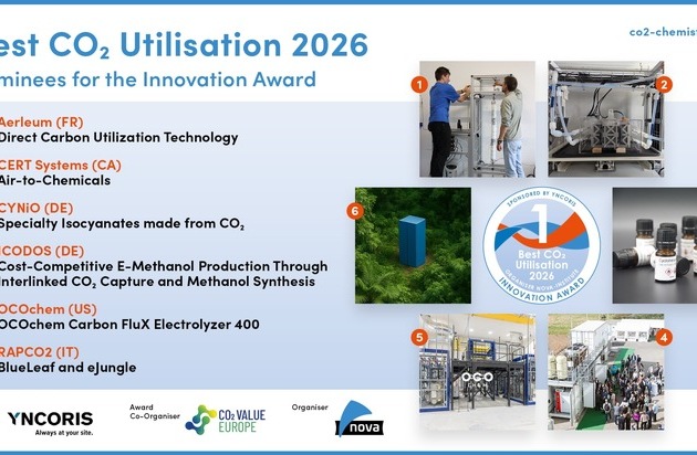Der Innovationspreis „Best CO₂ Utilisation 2026“ würdigt Innovationen, die CO₂ als Rohstoff nutzen. Das nova-Institut organisiert die Auszeichnung gemeinsam mit CO₂ Value Europe. Yncoris unterstützt den Innovationsaward als Sponsor. Die Nominierten präsentieren auf der Konferenz ihre innovativen Lösungen einem breiten Fachpublikum, welches die drei Gewinner in einer Live-Abstimmung wählt.