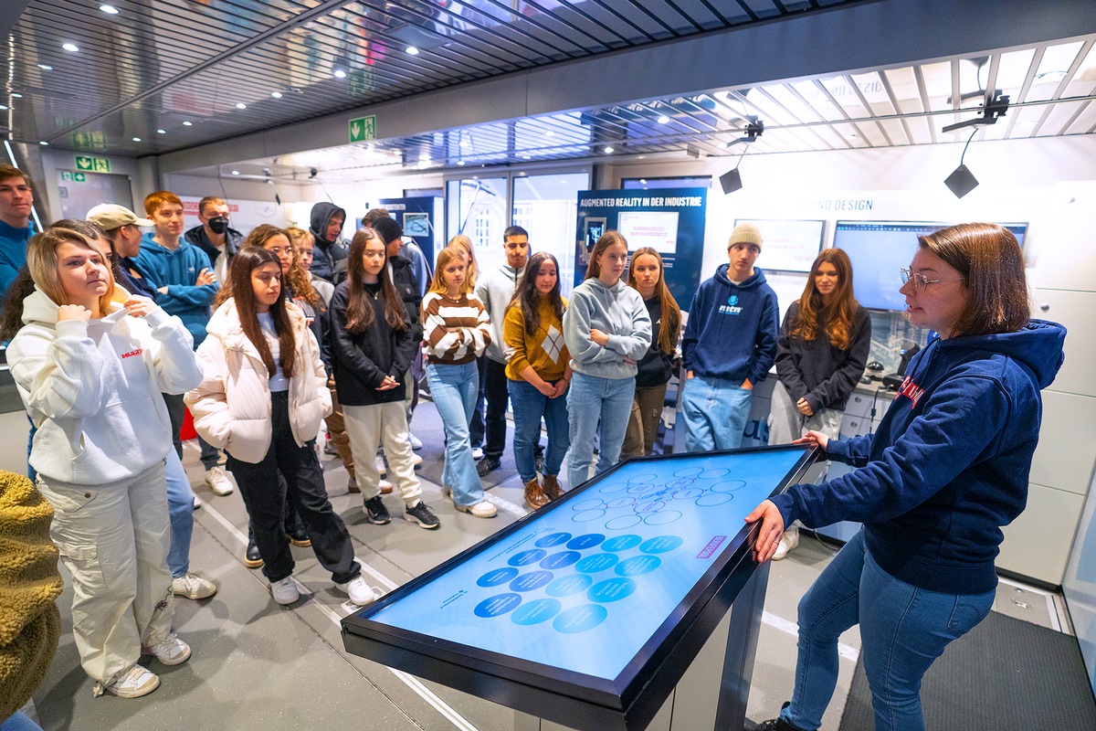 Ein 90-minütiger geführter Rundgang gibt Einblicke in das Denken und Arbeiten in technischen Berufen. Begleitet durch den Chemielaboranten Marco Umstätter und die Chemielaborantin Kathrin Graw starten die Schülerinnen und Schüler der 8. und 9. Klassen mit einer Zeitreise durch die industrielle Entwicklung an einem großen Touchtable. Danach erkunden sie an fünf Arbeitsstationen die moderne Produktentstehung. Sie digitalisieren Objekte mit einem 3D-Scanner, prüfen Materialien auf Fehler, programmieren einen Roboter und steuern eine intelligente Fertigungsanlage. Zum Abschluss erleben sie per VR-Brille die Komplexität moderner Logistiksysteme. Vier zusätzliche Exponatwände vertiefen Themen wie Augmented Reality, additive Fertigung und den Einsatz digitaler Assistenten in der Industrie.