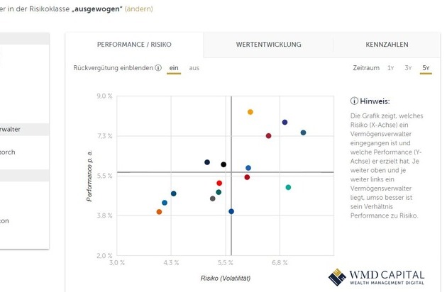 Genau hier setzt WMD Capital mit seiner digitalen Vermögensverwaltung an. WMD Capital bietet das Beste aus zwei Welten: Eine einfach verständliche digi-tale Anlagelösung kombiniert mit den professionellen Anlagestrategien der renommiertesten Vermögensverwalter.