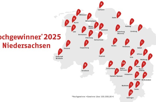 Im vergangenen Jahr konnten sich 136 niedersächsische Spielteilnehmer über einen Lotteriegewinn in Höhe von mindestens 100.000,00 € freuen. Von diesen Hochgewinnern haben 19 Spielteilnehmer Gewinne in Millionenhöhe erzielt.