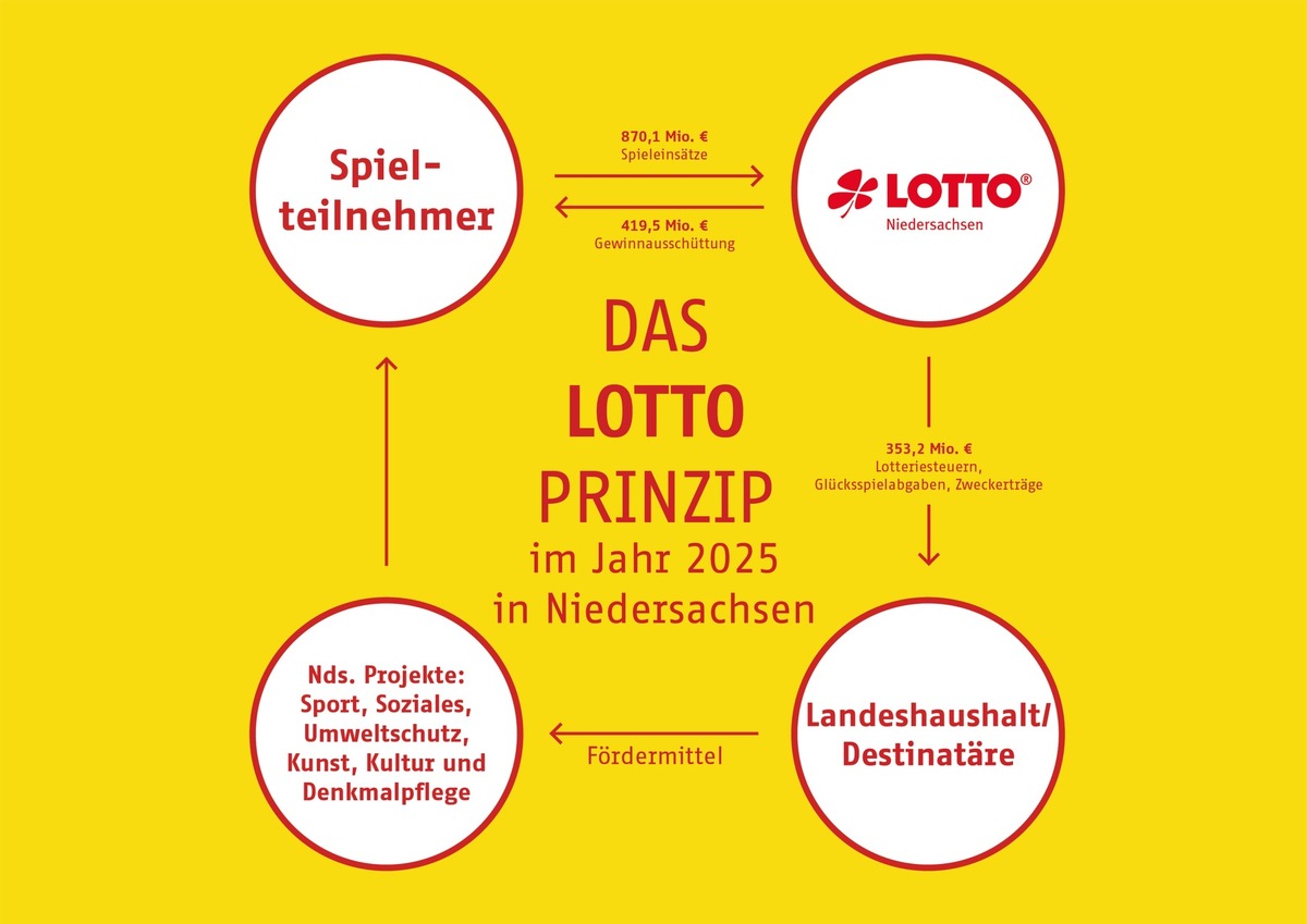 Auch für das Gemeinwohl in Niedersachsen trägt LOTTO Niedersachsen Verantwortung. Insgesamt rund 353,2 Mio. € hat das Unternehmen im Jahr 2025 in Form von Lotteriesteuern und Glücksspielabgaben an den Landeshaushalt sowie als Zweckerträge an die Destinatäre abgeführt. Die Gelder fließen in niedersächsische Projekte in den Bereichen Sport, Soziales, Umweltschutz, Kunst, Kultur und Denkmalpflege.