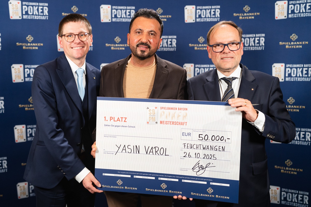 Der bayerische Pokermeister 2025 der 10. Spielbanken Bayern Pokermeisterschaft heißt Yasin Varol. Der über die Spielbank Feuchtwangen qualifizierte Spieler setzte sich im Finale der 10. Bayerischen Pokermeisterschaft durch und gewann das Hauptpreisgeld in Höhe von 50.000 Euro. "Die Spielbanken Bayern gratulieren zu diesem großartigen Sieg", so Joachim Buchwieser, Vizepräsident der Staatlichen Lotterie- und Spielbankverwaltung.