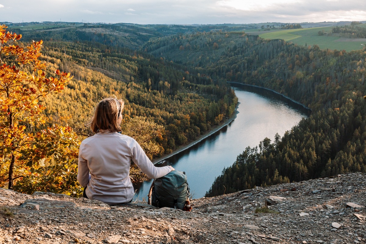 Ganz anders zeigt sich der Thüringer Wald am späten Nachmittag auf dem Hohenwarte- Stausee-Weg. Dieser wurde 2025 bei der Wahl zu "Deutschlands schönstem Wanderweg" mit dem 4. Platz ausgezeichnet. Auf der zweiten Etappe des insgesamt 75 Kilometer langen Fernwegs führt die Wanderung zwischen Linkenmühle und Ziegenrück auf schmalen Pfaden entlang des herbstlichen Mischwaldes. Immer begleitet vom Blick auf die glitzernde Wasserfläche der Saale. Langsam steigt man höher auf, bis ein Aussichtspunkt mit spektakulärem Blick erreicht wird. Garantiert huscht ein "Wow" über die Lippen. Denn hier oberhalb der Teufelskanzel, wo sich die Saale zu einer Schleife krümmt, wirkt sie fast wie ein in die Landschaft eingeschnittener Fjord.