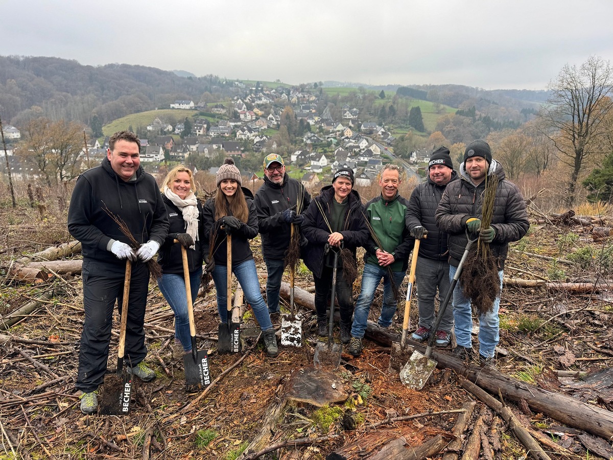 Die letzte Pflanzung fand im Bergischen Land statt, in dessen Region Becher mit den Standorten Wuppertal und Köln vertreten ist. Die Fläche in Kürten wurde vom Projektpartner Forstfreunde bereitgestellt und bot passende Bedingungen für eine erfolgreiche Umsetzung. Gepflanzt wurden Ahorn-, Linden- und Buchen-Setzlinge, die künftig eine stabile, standortgerechte und widerstandsfähige Mischwaldstruktur bilden sollen. „Die Fläche ist in ein umfassendes Aufforstungsprojekt von rund 100 Hektar eingebettet und dient künftig der naturnahen Wiederbewaldung. Sie soll als CO₂-Senke, Lebensraum und Lernfläche für regionale Nachhaltigkeitsprojekte genutzt werden und verbindet ökologische Vielfalt, Bodenschutz und regionale Wertschöpfung“, sagt Matthias Jouy.