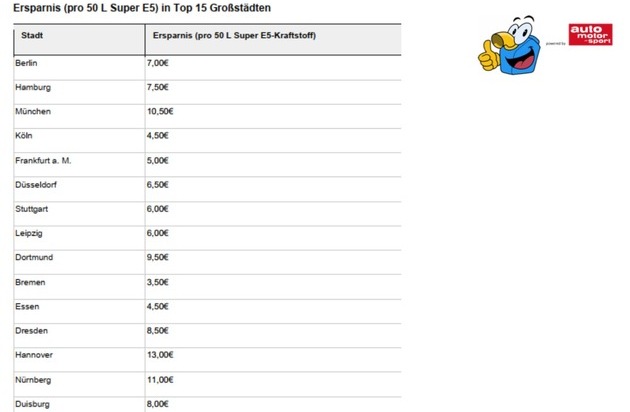 - Signifikante Preisgefälle: Auch in Nürnberg (11,00 EUR Ersparnis) und München (10,50 EUR Ersparnis) lassen sich durch gezielte Standortwahl zweistellige Beträge pro Tankvorgang einsparen.
