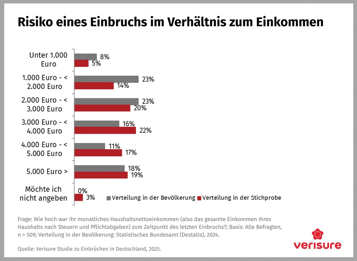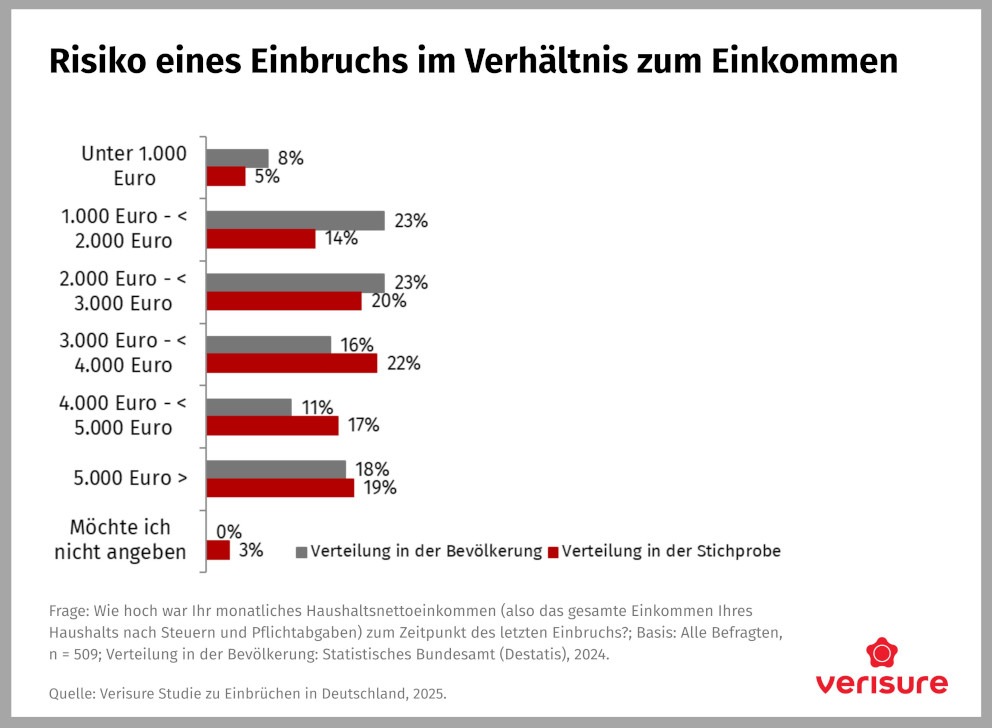 Einbrecher interessieren sich nicht nur für Häuser und Wohnungen von Reichen. Ein erhöhtes Risiko für einen Einbruch haben vor allem Haushalte mit einem monatlichen Nettoeinkommen von 3.000 bis 5.000 Euro. Deren Anteil an den Einbrüchen ist 6 Prozentpunkte höher, als ihr Anteil in der Bevölkerung beträgt.