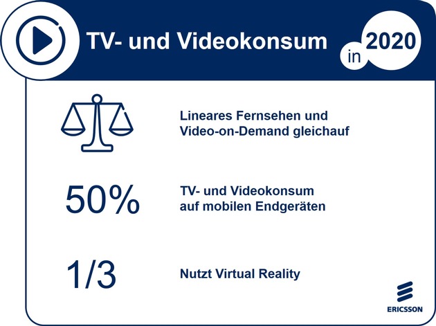 Das On-Demand-Fernsehen (Fernsehen abrufbarer Inhalte) wird bis 2020 weiterwachsen: auf fast 50 Prozent. Die Nutzung von mobilen Endgeräten (Tablets, Smartphones, Laptops) wächst verglichen mit 2010 um 85 Prozent. Auf das Smartphone wird 2020 etwa ein Viertel des TV- und Videokonsums entfallen, ein Anstieg von fast 160 Prozent seit 2010. Virtual Reality (VR) entwickelt sich immer mehr in Richtung Mainstream, 2020 wird bereits jeder Dritte die virtuelle Realität nutzen.