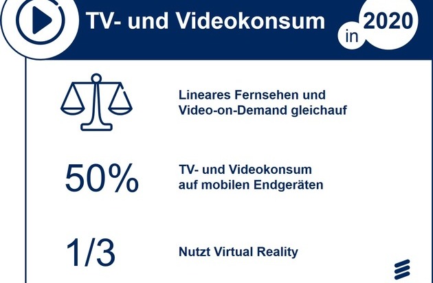 Das On-Demand-Fernsehen (Fernsehen abrufbarer Inhalte) wird bis 2020 weiterwachsen: auf fast 50 Prozent. Die Nutzung von mobilen Endgeräten (Tablets, Smartphones, Laptops) wächst verglichen mit 2010 um 85 Prozent. Auf das Smartphone wird 2020 etwa ein Viertel des TV- und Videokonsums entfallen, ein Anstieg von fast 160 Prozent seit 2010. Virtual Reality (VR) entwickelt sich immer mehr in Richtung Mainstream, 2020 wird bereits jeder Dritte die virtuelle Realität nutzen.