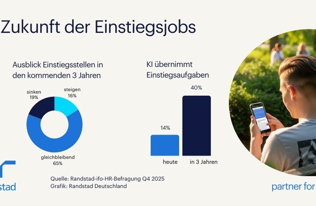 Berufseinsteiger:innen sind in vielen Unternehmen ein unverzichtbarer Bestandteil der strategischen Personalplanung - denn sie sind die Fach- und Führungskräfte von morgen. Die Randstad-ifo-HR-Befragung aus dem 4. Quartal 2025 zeigt: In der Mehrheit der Betriebe bleibt die Zahl der Stellen für Berufseinsteiger:innen in den kommenden Jahren konstant, doch knapp jedes fünfte Unternehmen rechnet mit einem Rückgang.