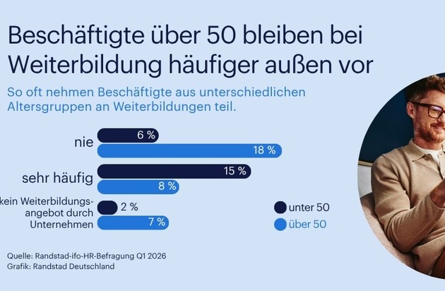 Weiterbildung ist für viele Unternehmen ein wichtiges Instrument, um neue Fähigkeiten aufzubauen und Mitarbeitende zu binden. Die Randstad-ifo-HR-Befragung für das 1. Quartal 2026 zeigt jedoch: Beschäftigte über 50 nehmen deutlich seltener an Weiterbildungen teil als jüngere Kolleg:innen. Damit steht ausgerechnet eine wachsende Beschäftigtengruppe, die angesichts eines Arbeitskräftemangels immer wichtiger wird, seltener im Fokus der Qualifizierung.
