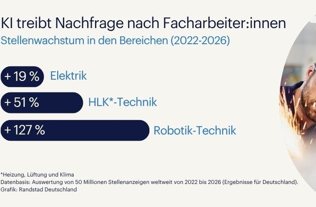 Außerdem verzeichneten im untersuchten Zeitraum die traditionellen Handwerksberufe weltweit ein Stellenwachstum von 27 % und übertrafen damit Bürostellen um 19 Prozentpunkte. "Mit der zunehmenden Verbreitung von KI-Anwendungen und digitalen Systemen steigt auch die Nachfrage nach Fachkräften, die die physischen Grundlagen für diese Systeme schaffen - oder industrielle Prozesse durch Robotik neu gestalten", betont Henri Viswat, CEO bei Randstad Deutschland.