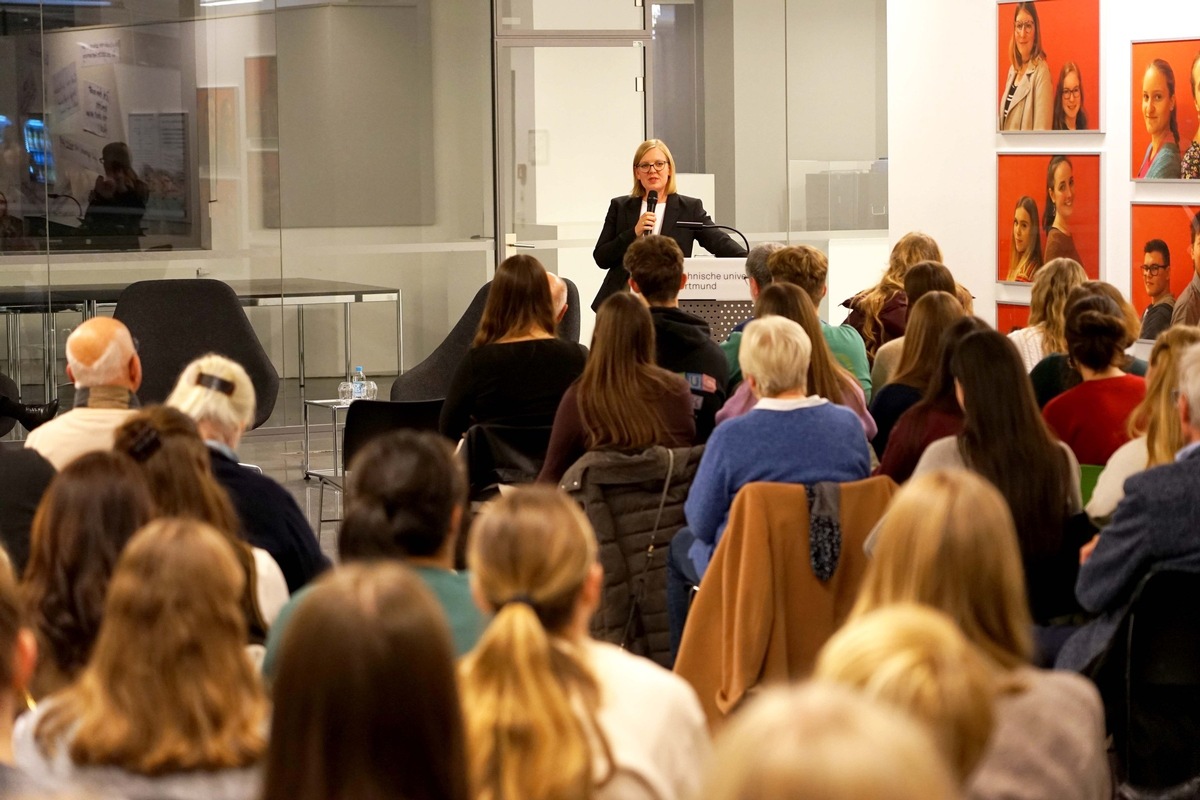 251121_religionsgespraeche_3: Auf der gut besuchten Veranstaltung „rethinking religion. Gespräche über Religion im Erzbistum Paderborn“ in Dortmund betonte die Theologin Dr. Franca Spies die verändernde Kraft der „kleinen Schritte“. Foto: Michael Bodin / Erzbistum Paderborn.