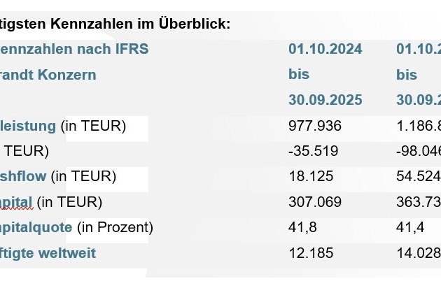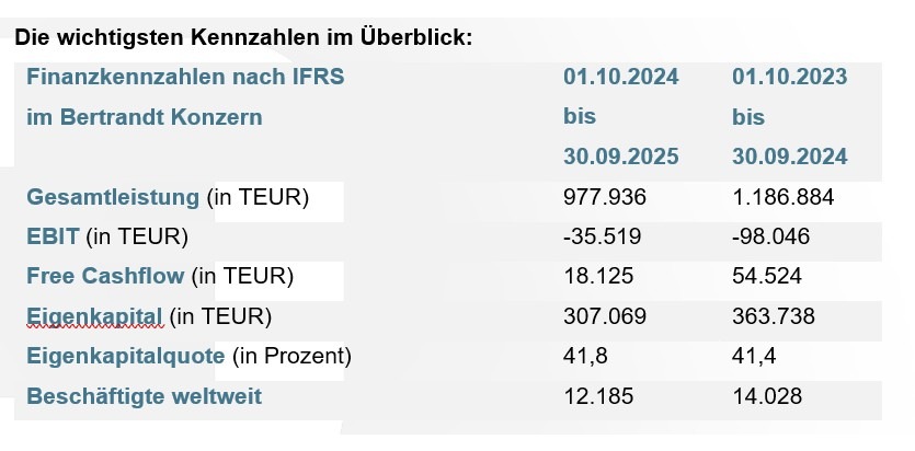 Die Gesamtleistung im Bertrandt Konzern sank im Geschäftsjahr 2024/2025 um rund 18 Prozent auf 978 Millionen Euro (Vorjahr 1,187 Milliarden Euro). Das EBIT in Höhe von rund -36 Millionen Euro (Vorjahr -98 Millionen Euro) hat sich vor dem Hintergrund spürbar positiver Effekte des Ergebnisoptimierungsprogramms deutlich gegenüber dem durch Sonderaufwendungen belasteten Vorjahreswert verbessert. Das bereinigte EBIT lag im Geschäftsjahr 2024/2025 bei -2 Millionen Euro. Hierzu hat auch ein wieder positives EBIT im vierten Quartal 2024/2025 beigetragen. Der Personalbestand wurde an die Marktbedarfe angepasst und reduzierte sich um 1.843 auf 12.185 Mitarbeitende zum 30. September 2025 (Vorjahr: 14.028). Trotz der anspruchsvollen Rahmenbedingungen konnte in der Berichtsperiode ein deutlicher positiver Free Cashflow in Höhe von rund 18 Millionen Euro erzielt werden. Auch die Bilanz stellt sich mit einer Eigenkapitalquote von über 40 Prozent als solide dar.