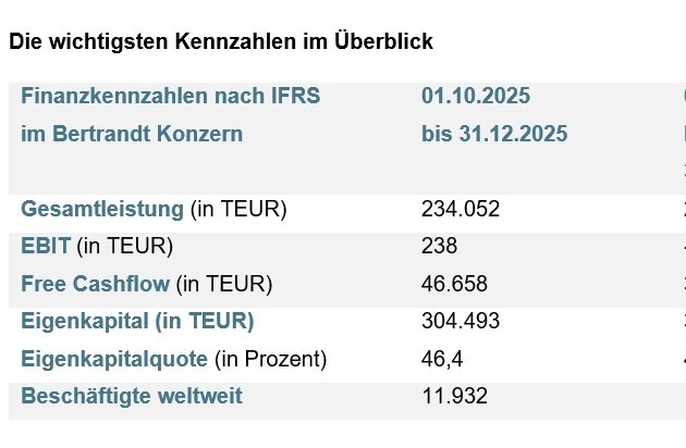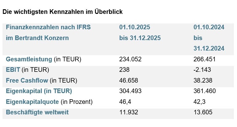 Bertrandt erzielte im ersten Quartal 2025/2026 eine Gesamtleistung von 234.052 TEUR (Q1 2024/2025: 266.451 TEUR) und blieb damit noch unter dem Vorjahresniveau. Gegenüber den beiden Vorquartalen zeigte sich jedoch bereits eine Stabilisierung der Geschäftsentwicklung. Das EBIT erreichte im Berichtszeitraum trotz der gesunkenen Gesamtleistung einen positiven Wert in Höhe von 238 TEUR (Q1 2024/2025: -2.143 TEUR). Die spürbare Verbesserung spiegelt die Wirksamkeit des Ergebnisoptimierungsprogramms "Fit for Future" sowie der darüber hinaus eingeleiteten Kostensenkungsmaßnahmen wider. Der Personalbestand sank zum 31.12.2025 auf 11.932 Mitarbeitende (Vorjahr: 13.605).