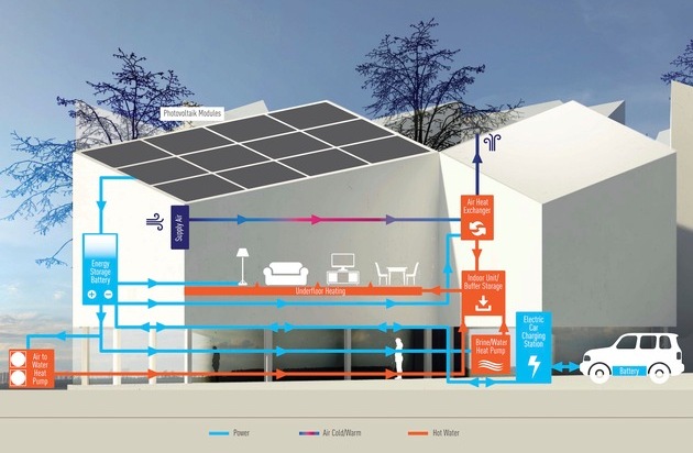 Der Strom- und Wärmefluss wird im gesamten Wohnprojekt "Future Living Berlin" automatisch in einem Kreislaufsystem reguliert. Strom und Wärme werden gespeichert und immer dorthin geleitet, wo sie gerade benötigt werden - egal von welcher Energie- oder Wärmequelle sie stammen. Photovoltaikanlagen versorgen den gesamten Campus und das Car-Sharing-System mit sauberer Energie. Gleichzeitig kann überschüssiger Strom aus Elektrofahrzeugen auch wieder über vernetzte Ladestationen zurück ins Kreislaufsystem geleitet werden. Wärmepumpen, wie die Aquarea Wärmepumpe von Panasonic, versorgen die Häuser im Winter mit Wärme und im Sommer kühlen sie Gebäude klimafreundlich auf angenehme Temperaturen herunter. Selbst die Wärme, die sich bereits in einem Raum befindet, entweicht im Berliner Porjekt nicht ungenutzt, denn spezielle Wärmetauscher bringen die Abluftwäre wieder in den Energiekreislauf ein.