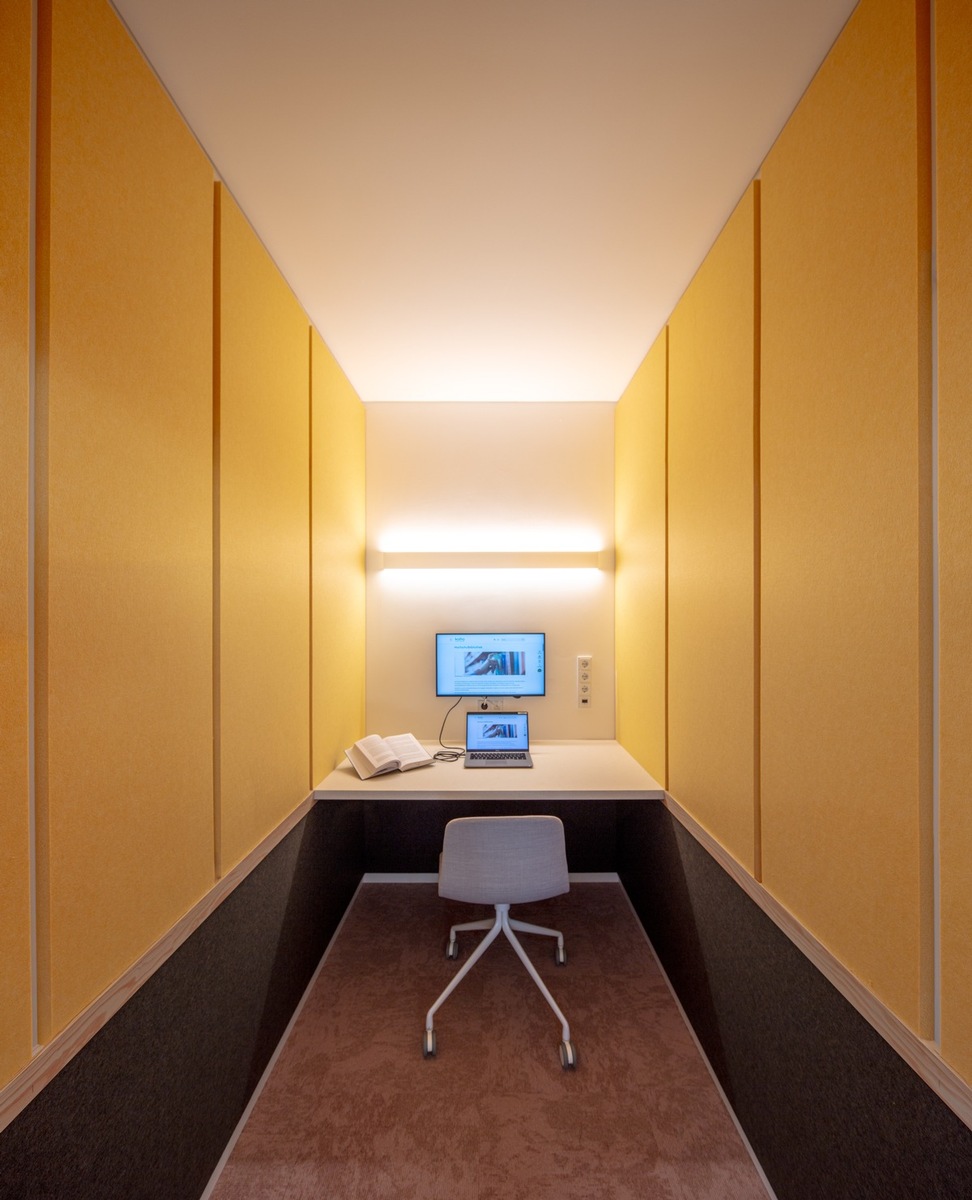 Sie umfassen ruhige Einzelarbeitsplätze, buchbare Lernkabinen mit Schreibtisch und Monitor zum konzentrierten Lernen, einen buchbaren Besprechungsraum für acht Personen, einen Gruppenbereich mit Kinderecke im ehemaligen Lesesaal sowie Arbeitsplätze am Fenster mit Blick auf die Wörthstraße („Workbar“).