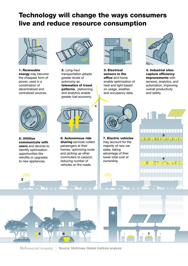 Die Studie zeigt: Von neuen Technologien werden vor allem Privathaushalte profitieren. Durch die effiziente und gesteuerte Nutzung von Strom, Heizung und Licht können Konsumenten weltweit ihre Kosten für den Energieverbrauch um bis zu 20 Prozent reduzieren. In Industrie und Wirtschaft könnte gleichzeitig die Energieproduktivität um bis zu 70 Prozent steigen. Die Folgen für die globale Wirtschaft sind positiv: Dem MGI zufolge sind - abhängig von Art und Umfang der zum Einsatz kommenden neuen Technologien - bis 2035 Einsparungen von bis zu 1,6 Billionen Dollar möglich.