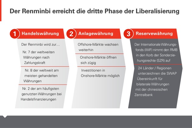 Chinas Bemühen zur Öffnung seiner Finanzmärkte wird nach Meinung der HSBC-Analysten nicht mit der Aufnahme des RMB in den Währungskorb enden. Schon in den nächsten Monaten dürften weitere Reformschritte folgen, welche die Währung und den Handel in und mit China weiter liberalisieren. So hat Peking bereits einen Plan vorgestellt, demzufolge in der Freihandelszone in Schanghai bald die volle Konvertierbarkeit des Renminbi in andere Währungen ermöglicht werden soll. Pilotprojekte wie dieses dürften den Weg für die vollständige Internationalisierung des Renminbi ebnen.