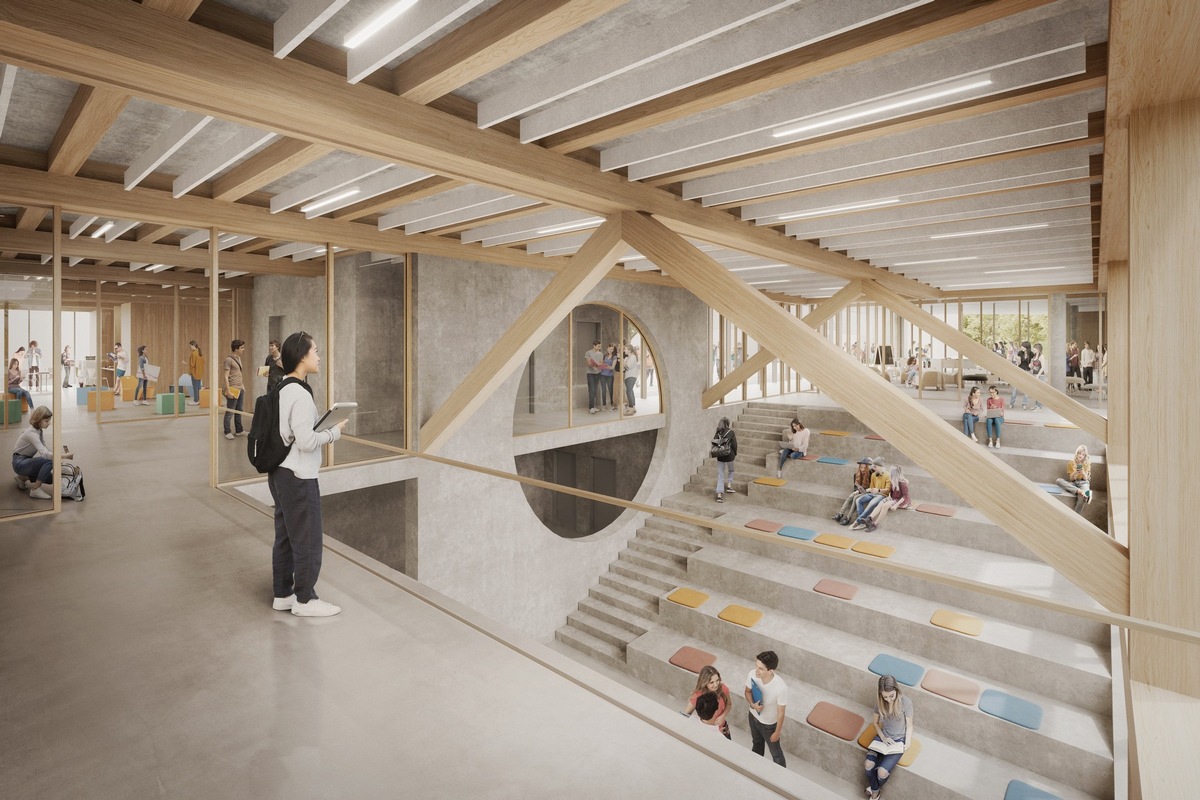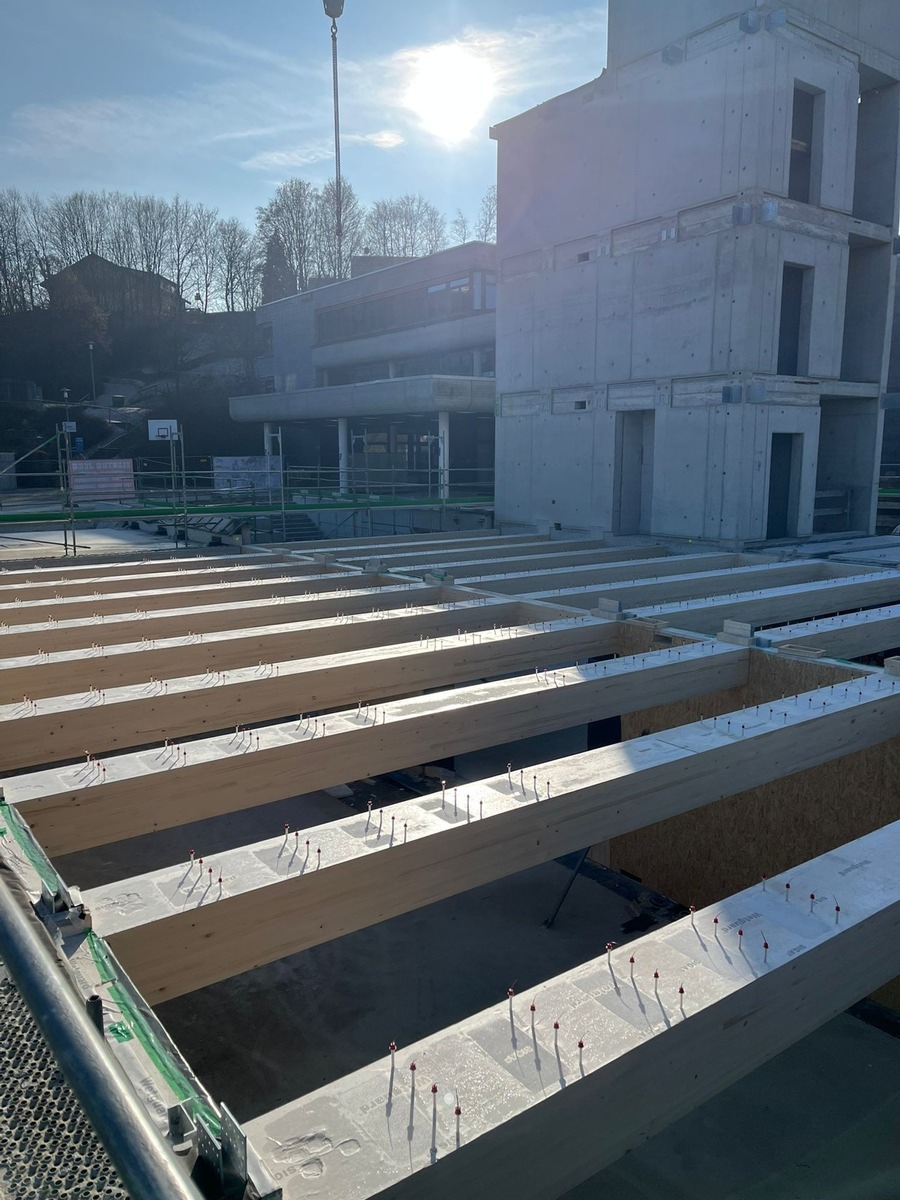 Mit einem neu zugelassenen rückbaubaren Verbinder-System werden im Neubau der Karl-Kessler-Schule in Aalen Holz-Beton-Verbunddecken realisiert, die eine technisch nachweisbare Trennung von Holz und Beton ermöglichen.
