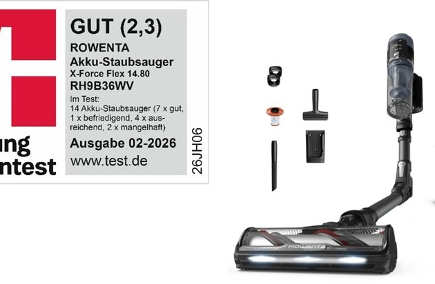Frankfurt am Main, 3. Februar 2026 – Der Rowenta X-Force Flex 14.80 (RH9B36) ist mit der Gesamtnote GUT (2,3) der zweitbeste Akku-Staubsauger im aktuellen Test der Stiftung Warentest (Ausgabe 02/2026). Insgesamt wurden 14 Modelle von Stiftung Warentest einer Prüfung unterzogen, die vergebenen Bewertungen reichen dabei von GUT bis MANGELHAFT. Mit dem X-Force Flex 13.60 Allergy (RH9A36), der bereits in Ausgabe 02/2025 von Stiftung Warentest ausgezeichnet wurde, platzierte sich zudem ein zweites Rowenta-Modell unter den mit „GUT“ bewerteten Akku‑Saugern.