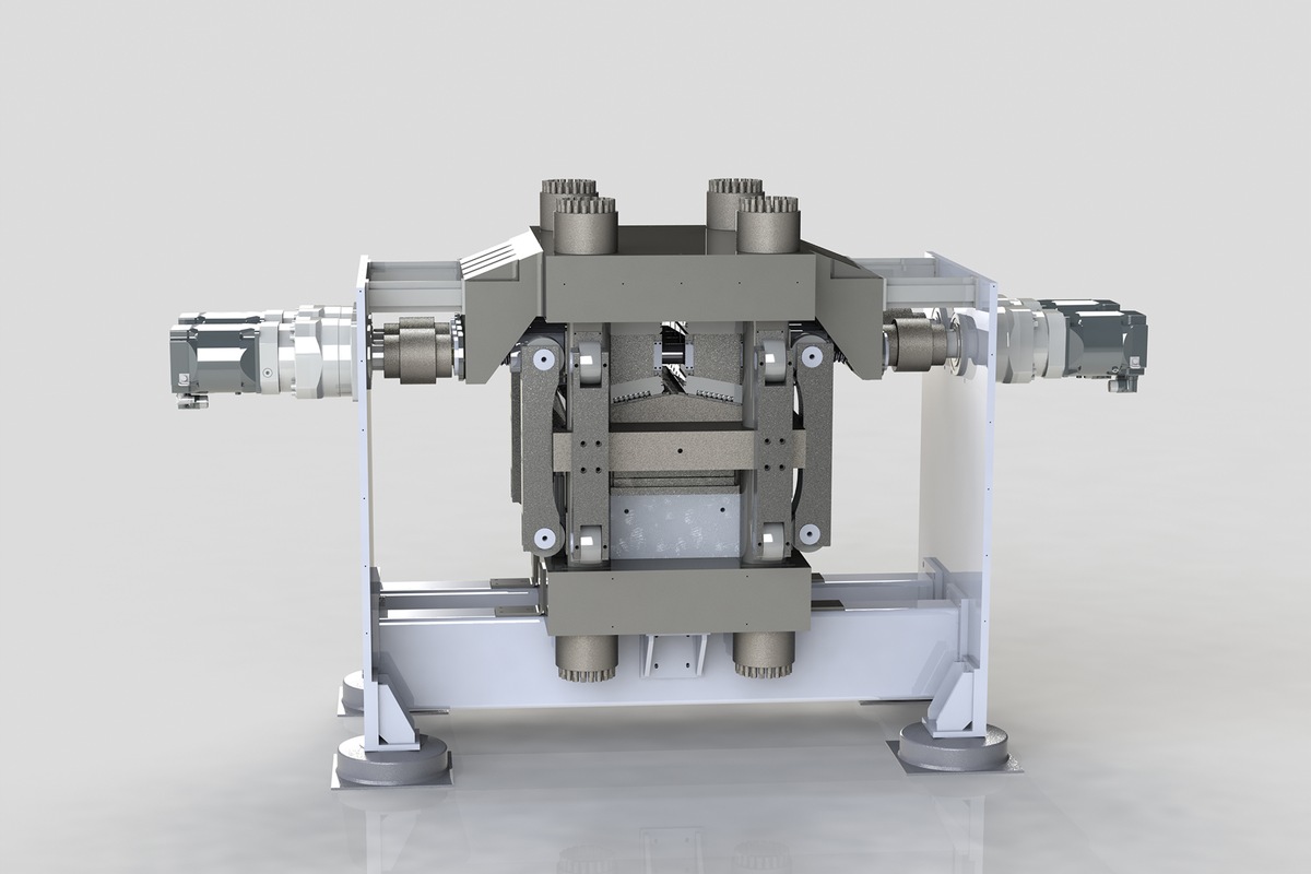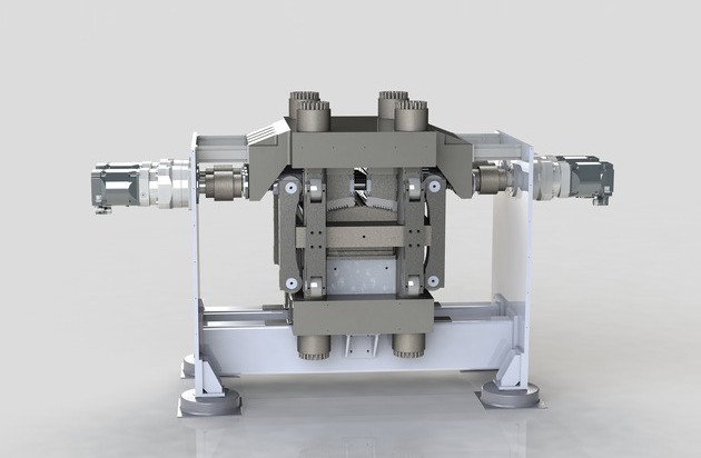 The drive systems in modern presses work with discrete force transmission to the progressive die tool via the press ram, using only a few bearing points. However, this requires large and rigid structures to distribute the force as evenly as possible across the tool. When forming thin sheet metal, commonly used for bipolar plates, industry requires a particularly high degree of accuracy with very low tolerances of less than 10 µm.