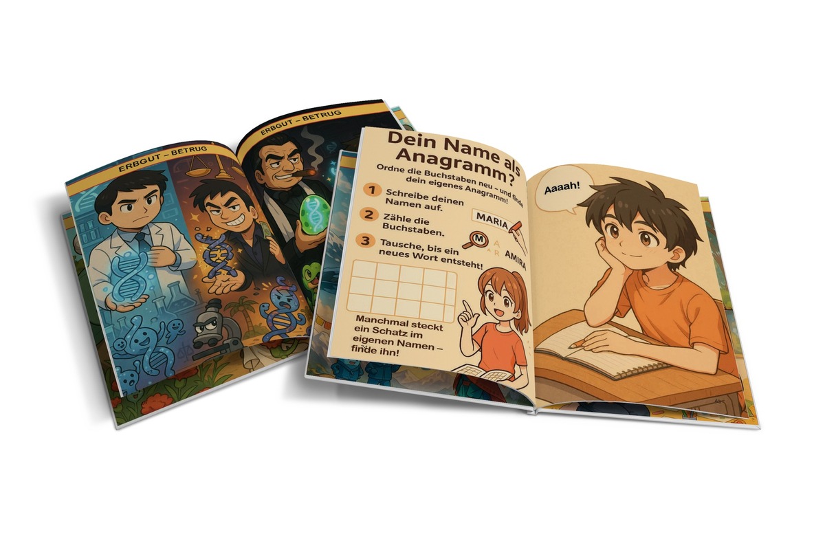 Anagramme bestehen aus denselben Buchstaben wie ihr Ausgangswort, nur in neuer Reihenfolge. „Nofretete & Tortenfee – Amüsante Anagramme von A bis Z“ erklärt dieses Prinzip anhand kurzer, grafisch klarer Einstiegsseiten und führt anschließend durch 30 Anagramm-Paare von A bis Z. Jede Wortverwandlung wird durch eine humorvolle Szene ergänzt, die den Bedeutungswechsel sichtbar macht. Neben dem reinen Wortspiel steht der erzählerische Effekt im Vordergrund: Die Illustrationen arbeiten mit wiedererkennbaren Motiven, einem warmen Farbraum und klarer Linienführung. Dadurch entsteht ein Lesefluss, der sowohl im gemeinsamen Anschauen als auch beim eigenständigen Schmökern trägt.