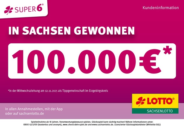 Die Gewinner aus dem Erzgebirge sind für die LOTTO-Gesellschaft anonym und müssen ihre Gewinne nun selber anmelden. Dies können sie in jeder SACHSENLOTTO-Annahmestelle.