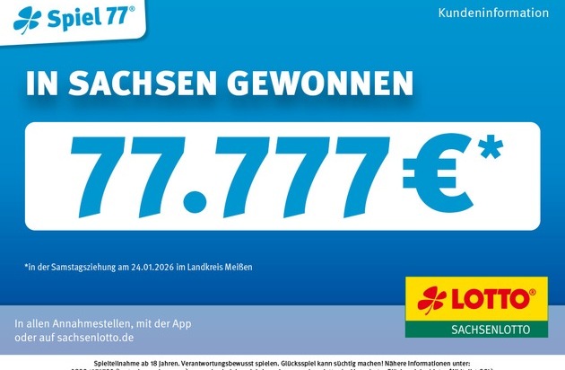 Während einige Teile Sachsens in Schnee gehüllt sind, sorgt ein Sachsenlotto-Gewinn für warme Gedanken: Im Landkreis Meißen wurden mit sechs richtigen Endziffern bei Spiel 77 genau 77.777 Euro gewonnen – gespielt wurde in einer Annahmestelle.